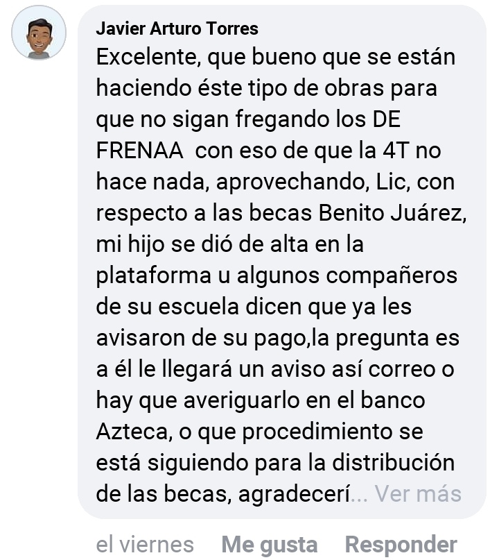 “Javier Arturo Torres … aprovechando, Lic, con respecto a las becas Benito Juárez, mi hijo se dió de alta en la plataforma u algunos compañeros de su escuela dicen que ya les avisaron de su pago, la pregunta es a él le llegará un aviso así correo o hay que averiguarlo en el banco Azteca, o que procedimiento se está siguiendo para la distribución de las becas, agradecería muchísimo la información”