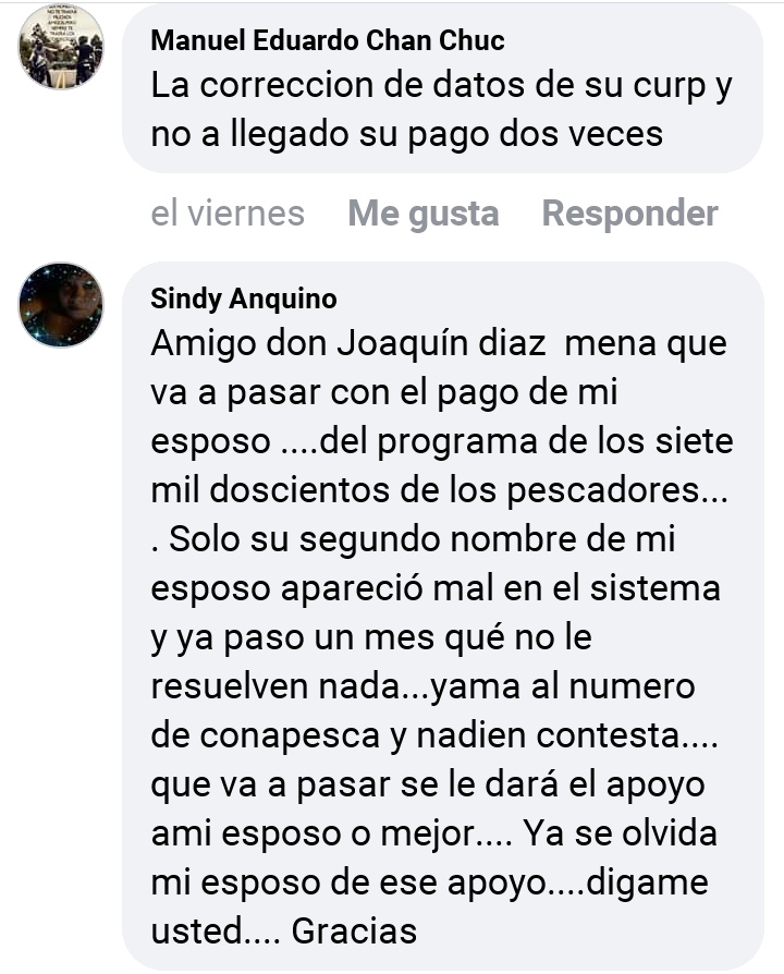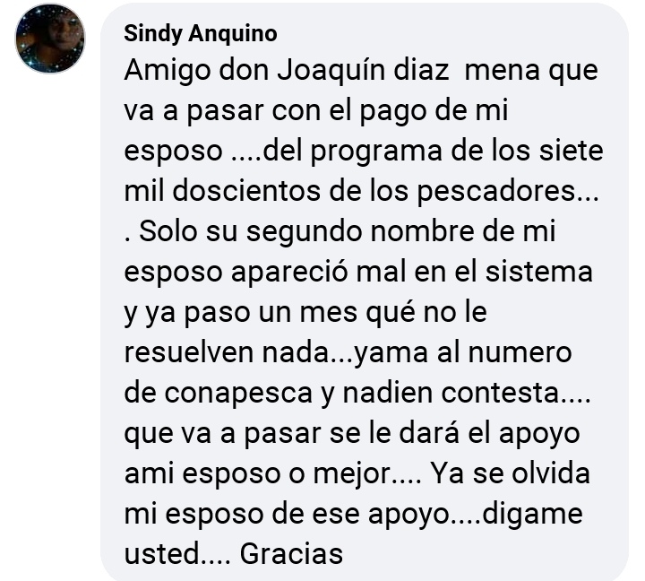 “Sindy Anquino Amigo don Joaquín diaz mena que va a pasar con el pago de mi esposo ….del programa de los siete mil doscientos de los pescadores…. Solo su segundo nombre de mi esposo apareció mal en el sistema y ya paso un mes qué no le resuelven nada…yama al numero de conapesca y nadien contesta….que va a pasar se le dará el apoyo ami esposo o mejor…. Ya se olvida mi esposo de ese apoyo….digame usted…. Gracias”