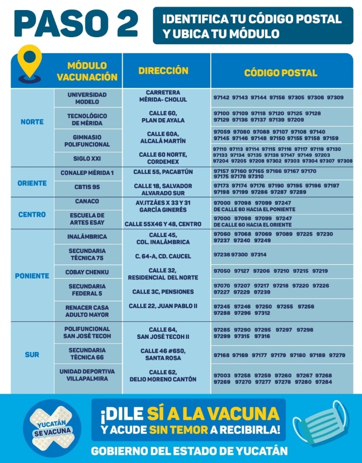 El segundo paso consiste en identificar el código postal de residencia, al cual le corresponderá alguna de las sedes donde se aplicará la vacuna y los cuales se distribuyen de la siguiente manera: