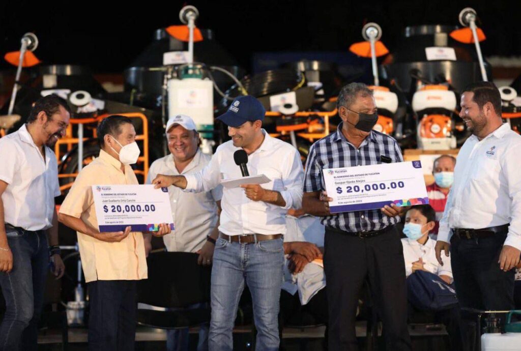 Desde el parque de Las Armas de la Concha Acústica de Ticul, repartió apoyos del Programa Peso a Peso, mediante el cual este año se favorece a más de 16,000 productores de todo el estado con la aplicación de recursos por más 151 millones de pesos.