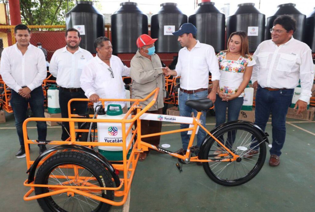 Como parte de su gira de trabajo por este municipio, Vila Dosal, en compañía de alcalde local, Galdino Poot Moreno, encabezó las entregas de insumos, equipos y herramientas del programa Peso a Peso que incluyen carretillas, motosierras, bombas aspersoras, fumigadoras, triciclos, entre otros, con lo que se beneficia a 350 productoras y productores, quienes a través de una inversión conjunta de casi 2 millones de pesos adquirieron un total de 5,178 productos para la mejora de su producción y economía.