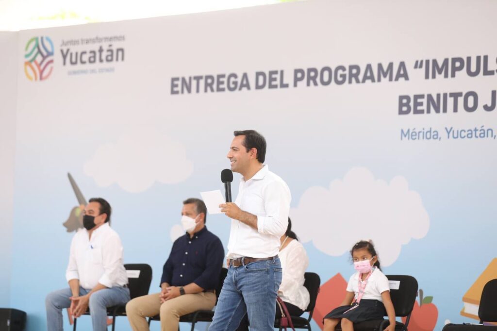 -En la Primaria Federal “Benito Juárez García”, Vila Dosal entregó estos apoyos, que representan para las familias yucatecas un ahorro de 2,850 pesos por cada estudiante.