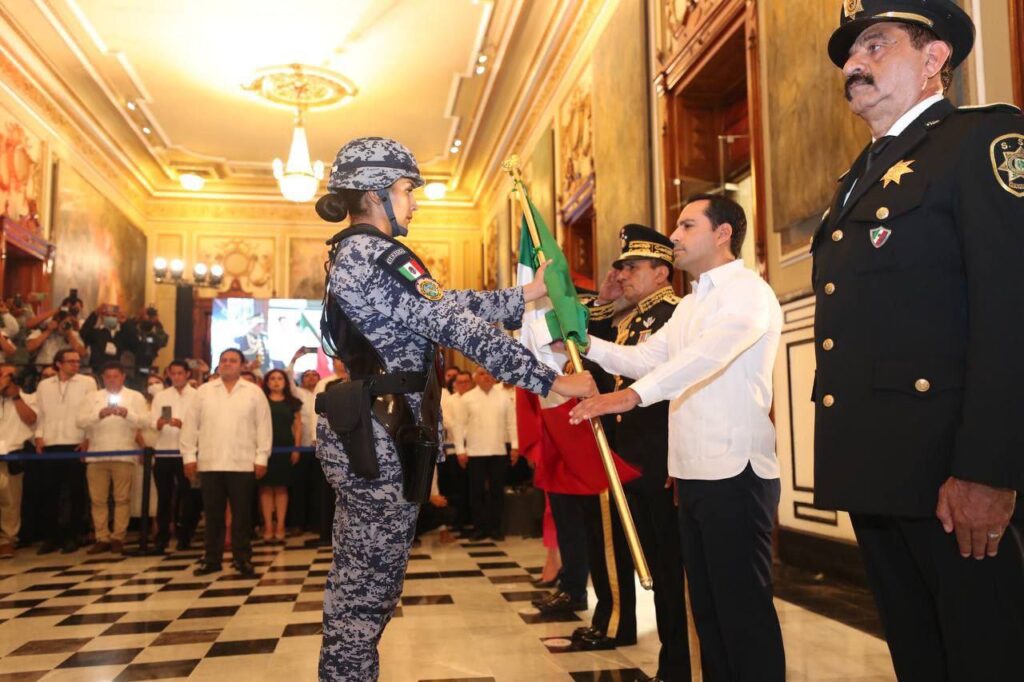 Minutos antes, Vila Dosal encabezó los honores de ordenanza y recibió el lábaro patrio de manos de la Teniente Fuerza Aérea Controlador de Vuelo, Cielo Nadxiely García Arteaga, comandante de la primera escolta mixta de elementos de las Fuerzas Armadas que, por primera vez, fue la encargada de entregar la bandera nacional al Gobernador.