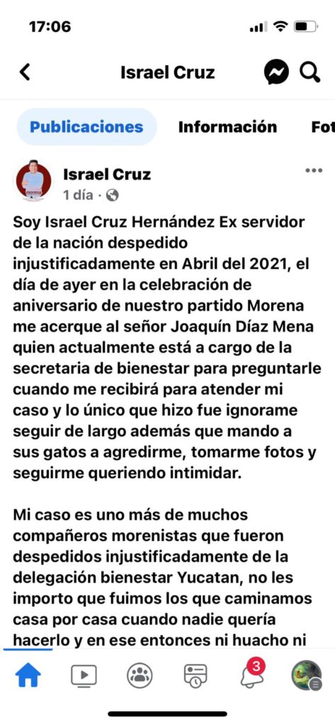 Israel Cruz menciona en sus redes sociales que su caso “es uno más de muchos compañeros morenistas que fueron despedidos injustificadamente de la delegación bienestar Yucatán”.