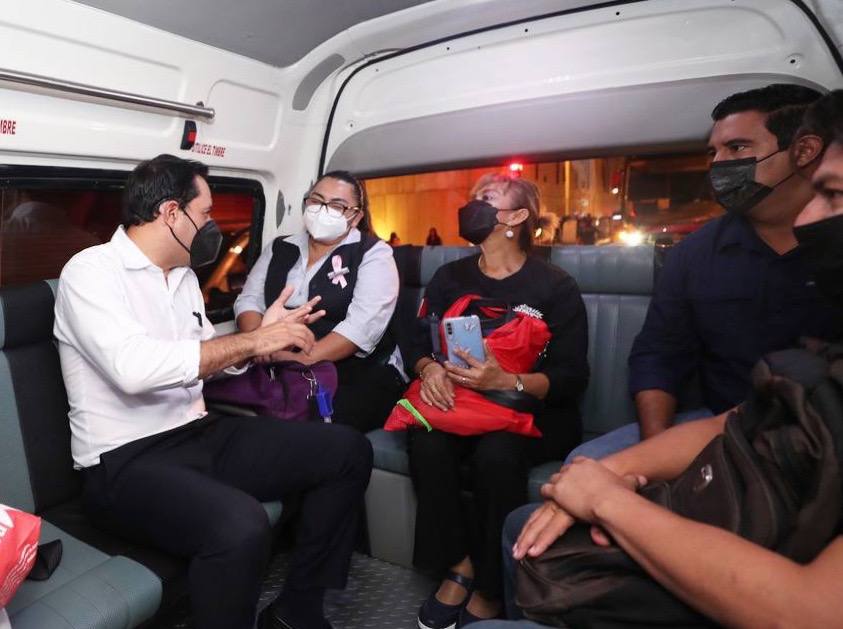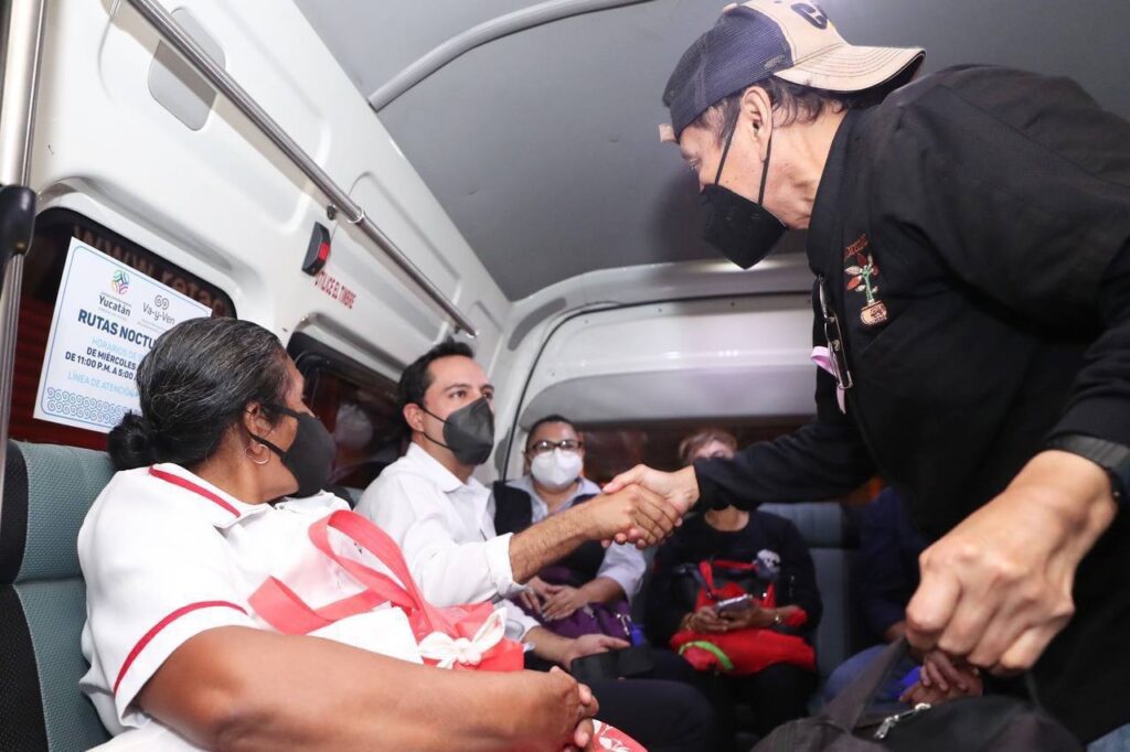 En el trayecto Vila Dosal platicó con Margarita y Miguel, ciudadanos que se dirigían a sus hogares después de cumplir con sus jornadas laborales, quienes le agradecieron por la implementación de las rutas nocturnas, pues esto les permite regresar con sus familias con bien y en un medio de transporte seguro, ágil y que no afecta el bolsillo familiar.
