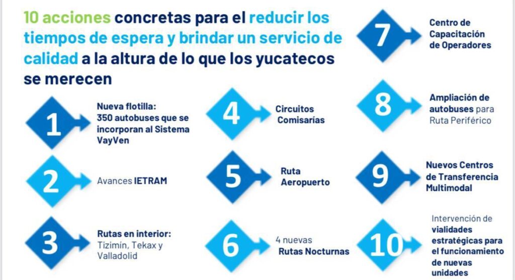 -Como parte del Sistema de Transporte “Va y ven”, Vila Dosal presenta 10 acciones concretas para reducir los tiempos de espera y brindar un servicio de calidad a la altura de lo que los yucatecos merecen.