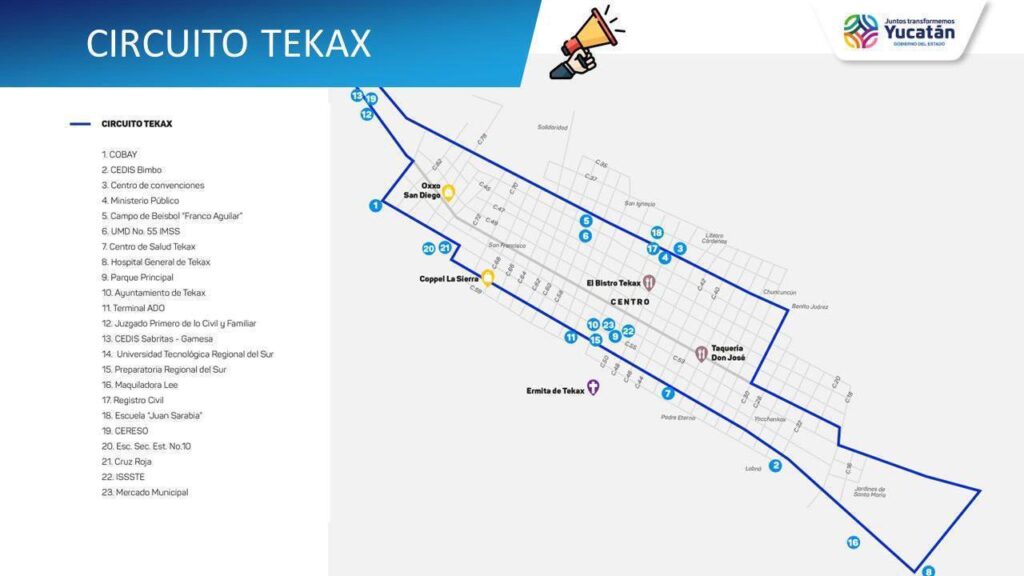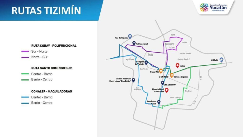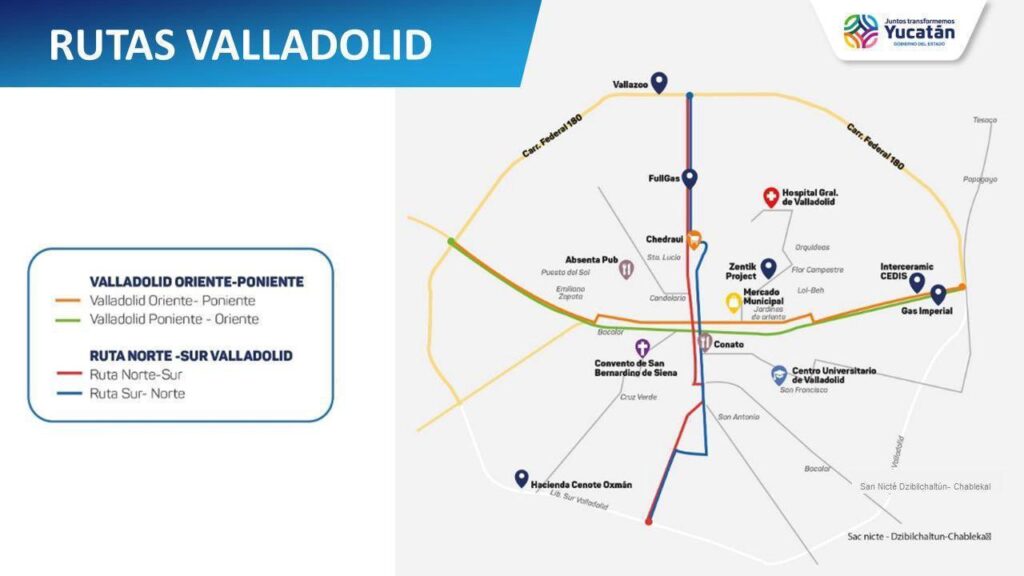 Respecto a la implementación de rutas en los municipios: en Valladolid será un nuevo circuito y 2 rutas transversales; en Tizimín, serán 3 nuevos circuitos; y en Tekax un circuito, todas integradas al sistema Vaivén, con pago electrónico, frecuencia de 30 minutos y unidades con accesibilidad universal.