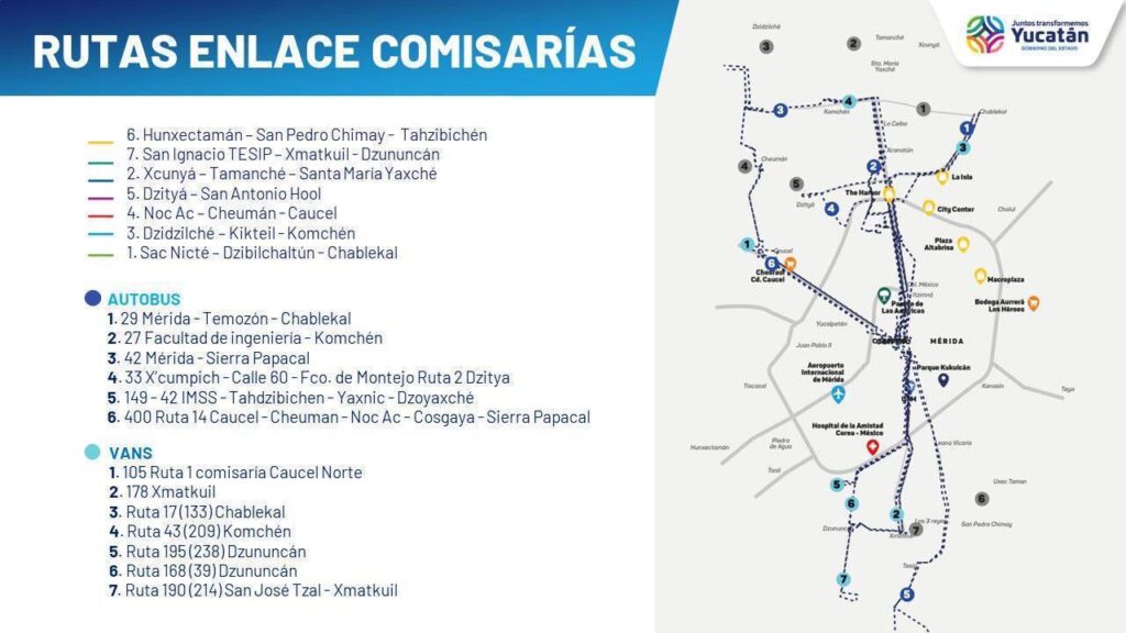En las comisarías, se contempla la creación de 7 nuevas rutas rápidas, con lo que se conectarán 20 comunidades con Mérida, así como 13 rutas del transporte público, beneficiando a 14,900 personas con frecuencias de 30 minutos y autobuses one step con accesibilidad universal.