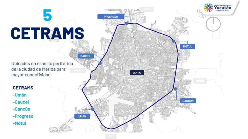 En relación con los Centros de Transferencia Multimodal, se dio a conocer que serán 5, en Progreso, Motul, carretera Cancún, Umán y Caucel, mismos permitirán la interconexión de varios modos de transporte, con baños, taquillas, priorizando el uso del transporte público, las transferencias de los usuarios, así como el desarrollo de la infraestructura para peatones y ciclistas