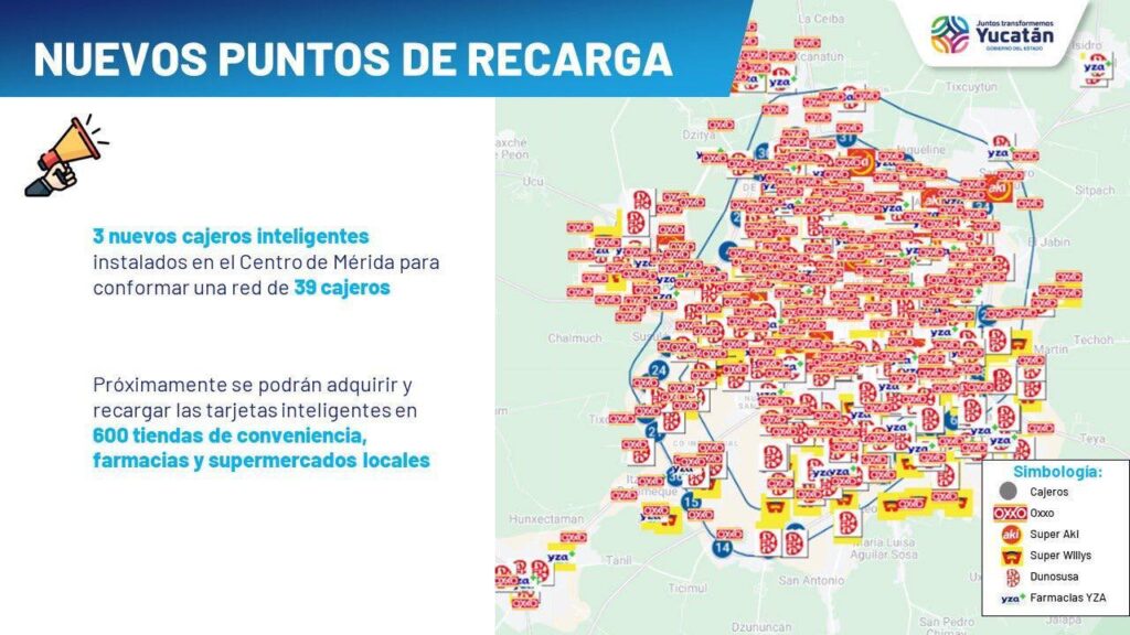 Se agregarán 3 nuevos cajeros inteligentes instalados en el Centro de Mérida para conformar una red de 39 cajeros y próximamente se podrán adquirir y recargar las tarjetas inteligentes en 600 tiendas de conveniencia, farmacias y supermercados locales. También otros elementos de recarga desde el celular, además de los cajeros y las tarjetas de circuito cerrado, informó Vila Dosal.