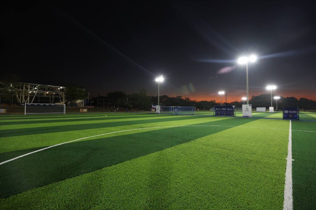 Los modernizados espacios deportivos del Complejo Deportivo Kukulcán comprenden 4 canchas de pasto sintético y 2 de pasto natural, la instalación de iluminación led, así como un sistema de riego, como parte de los esfuerzos que realiza el Gobernador para seguir impulsando el deporte brindando espacios de calidad a través de una inversión de 20.5 millones de pesos, pues cuentan con pasto sintético, bancas profesionales, gradas, porterías movibles, así como malla divisoria.