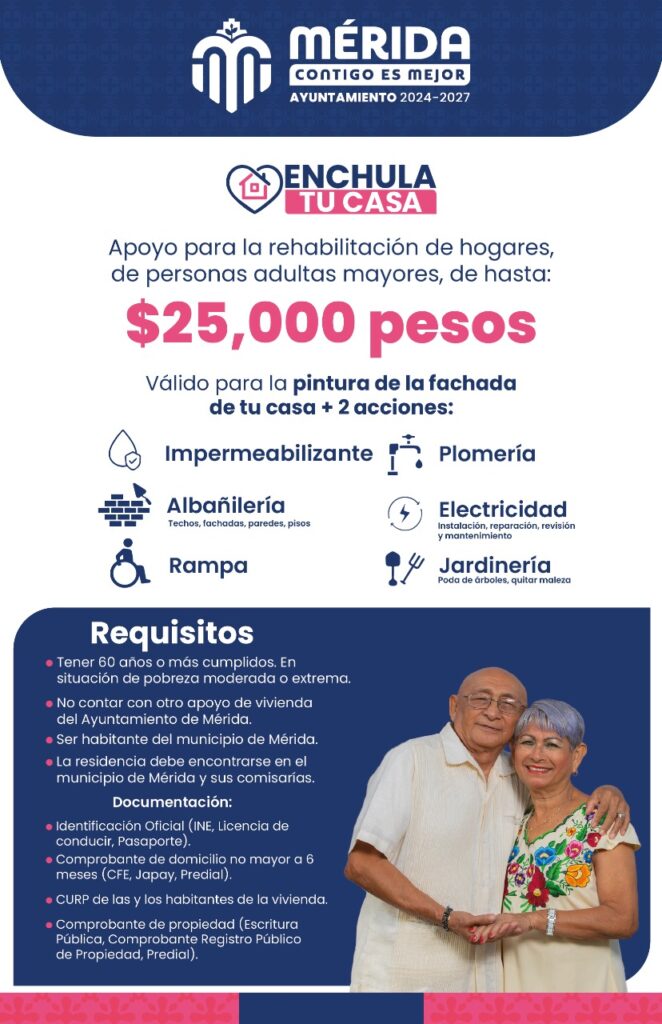 Cómo parte de los primeros 100 días de acción por una Mérida más justa, solidaria y digna, la Presidenta Municipal Cecilia Patrón Laviada presentó el programa “Enchula tu Casa” para cambiar la vida y mejorar la vivienda de personas mayores que se encuentren en situación de abandono o de pobreza.